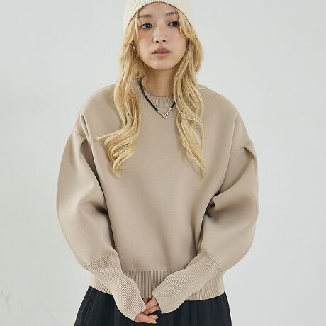 立体的な袖のシルエットが目を引く、スウェットライクな表情のニット。