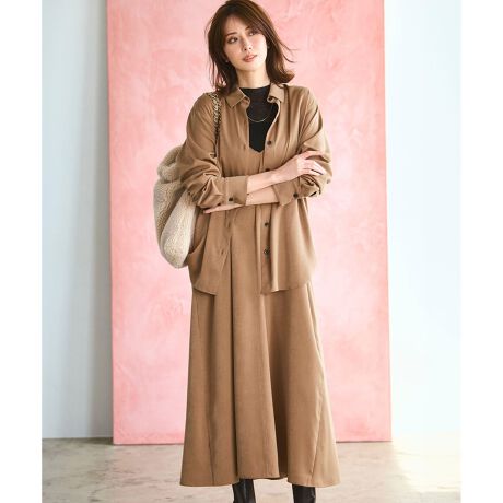 華奢な細身の肩ストラップで大人でも取り入れやすいキャミソールワンピース。やわらかく落ち感のある素材感で、裾にかけて分量感をもたせることで、エレガントに広がるデザイン。暑さが残る時期には、インナーにカットソーをあわせてカジュアルに、薄手のニットをあわせてフェミニンに。寒さを感じる時期には、羽織りにシャツやジャケットを重ねてきれいめに。晩夏から春先まであわせるアイテムで幅広い着こなしを楽しめます。同素材のシャツとセットであわせるスタイリングもおすすめです。カラーは、素材感を引き立てるこっくりとした色合いのキャメル(#034)、アイボリー寄りの優しい印象のベージュ(#033)、甘すぎないシックな雰囲気のカーキ(#054)の3色展開です。