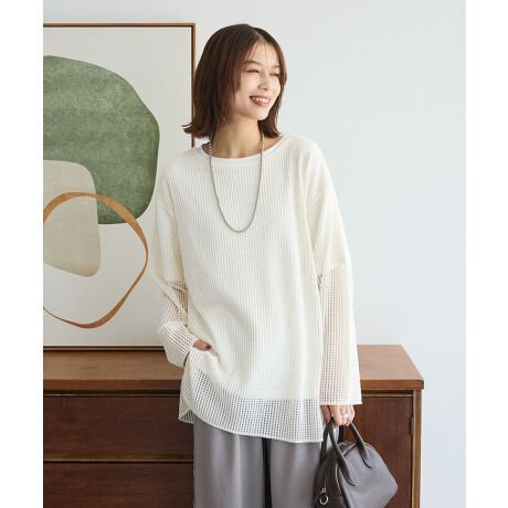 トレンドのシアーメッシュ素材でカジュアルに仕上げたプルオーバー。前後どちらを前にしても着用できる2WAY仕様もポイントです。ゆるりとしたサイズがラフでこなれた雰囲気を演出。透け感を活かして色柄物インナーとのコントラストを楽しむのもおすすめです。合わせ方次第で着こなしの幅も広がる魅力的なアイテムです。透け感[ややあり]
