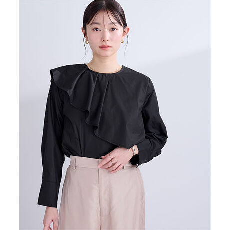 ◆DETAILアシンメトリーのデザインで程よいボリュームの華やかな一枚。ネックラインにタックを施してふんわりしたラッフルデザインに仕上げました。◆FABRICさらっとしたコットンブレンドのシャツ素材[型番:BFXU1781]