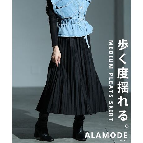 どんなトップスとも相性がいい黒のプリーツスカートはコーディネートの主力として活躍すること間違いなし!今年はミディアム丈がトレンドということもあり、この秋存分に来ていただきたい一押しアイテムです。