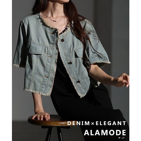 【ジャケット】 アウター 羽織り ブルー 青 デニム 半袖 5分袖 綿 コットン フリンジ ショート