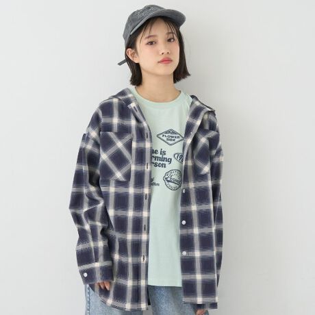 大胆なチェック柄が目を引くシャツパーカとロンTのセットです。