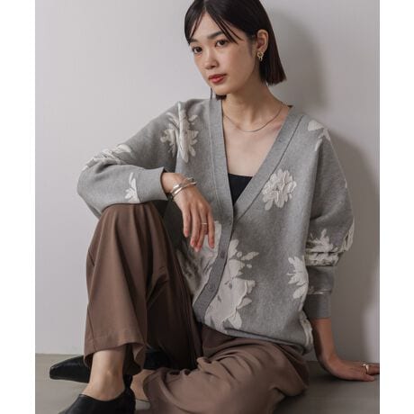 抽象的なフラワー柄を、落ち着いた単色で仕上げたジャガードニットカーディガン。派手すぎず、それでいて人とかぶらない絶妙な存在感です。柄部分は袋編みで立体感があるのも魅力。ゆったりとしたドルマン袖と、程よいゆとりのある身頃が、リラックスした大人の着こなしにぴったり。Vネックで顔まわりもすっきり見せてくれます。