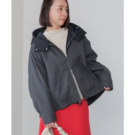 フードのついた中綿のブルゾン。フロントはダブルジップになっています。裏地はメッシュになっていてスポーティーで、前側にポケットもついていて実用的です。袖口にスナップ、裾にドローコードがあり絞れるのでシルエットも自由に変えられ、寒い時期は風が入ってくるのを防げます。