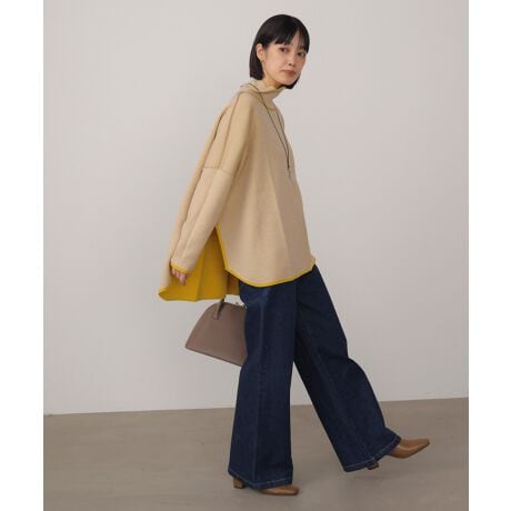 配色が際立つリバーシブルデザインで、着こなしの幅が広がります。首元にやさしく沿うハイネックは、後ろのスリットでほどよい抜け感をプラス。ポンチョ風の四角いシルエットと両脇スリットで、動きやすく体型カバーも自然に叶えます。