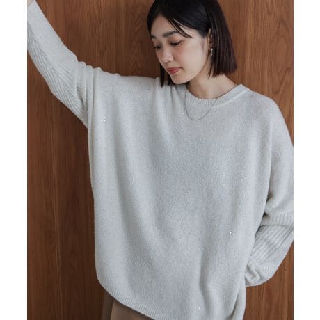 細かなラメがかわいいシンプルカーディガン。ほどよいシアー感があるので暑い時期から着用可能。型はシンプルで大人っぽいベーシック型にしています。フロントはあえてボタンをなくして軽く仕上げることで羽織ったときに抜け感があって◎