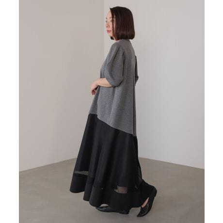 パウンドケーキの様に軽く柔らかい素材を使用したワンピース。柔らかくもっちりとした肌触りで着心地抜群なので人気の素材です。そのパウンドストレッチ生地をベースに、メッシュの生地をアシンメトリーに配置して、着映え抜群に仕上げました。袖が丸みを帯びているシルエットなので気になる二の腕もカバーできます。
