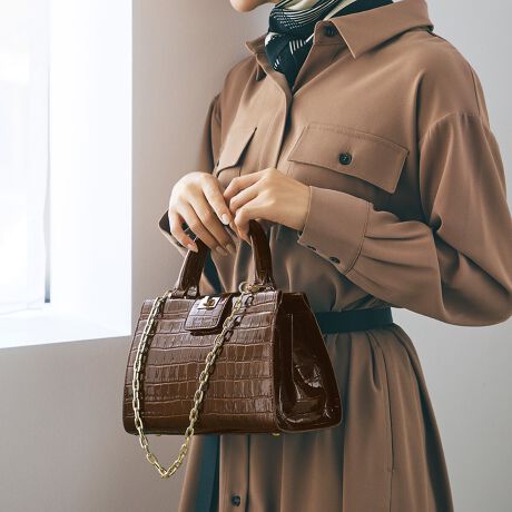 光沢感のある合成皮革にクロコ型押しを施したラグジュアリーなデザイン。
