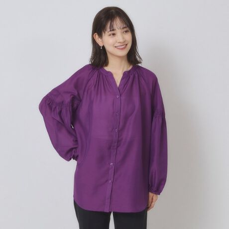 ボリュームのある袖にはシャーリングデザインのアクセントをプラス。
