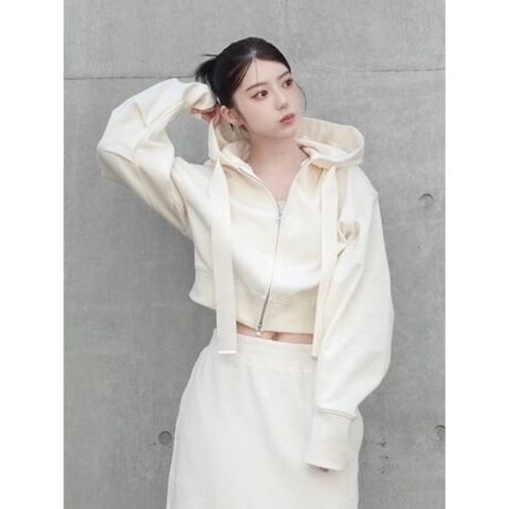 すっきりとしたコンパクトなボディに、ボリュームスリーブのシルエットが今季らしいジップアップフーディー。