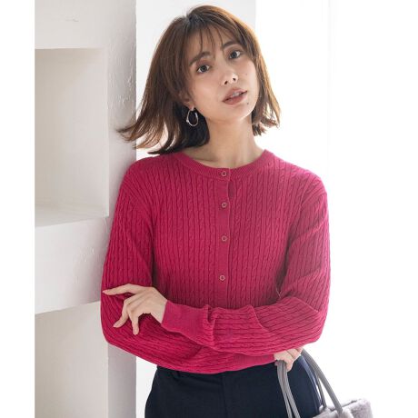 ・気品のある細めのケーブル・トレンドの刺繍ディテールが今年らしいポイントに・同色染めの金縁ボタンが上品・ケーブル編みとカラーが秋らしい雰囲気を演出