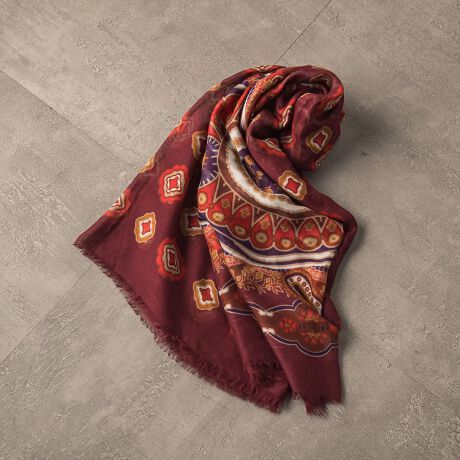イタリア製ならではのシックな色使い、クラシカルなペイズリーと小紋柄を切替えたデザインは、巻き方によって違う表情を楽しめます。