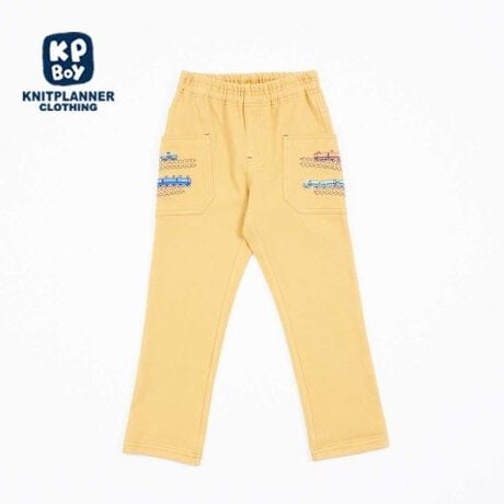 両脇のポケットがアクセントのニットツイル素材のパンツ。電車の刺しゅうがポイントです。伸び伸びストレッチが効いてはきやすく、柔らかな風合いです。シルエットもすっきり見えます。ウエスト総ゴム仕様になっています。