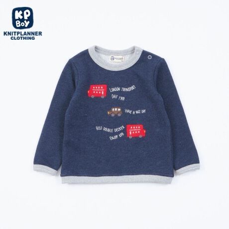 ロンドンバスのアップリケが楽しいカラー杢裏毛のトレーナー。落ち着いた色合いにロンドンバスが引き立っています。衿、袖口と裾が配色カラー。後ろの小さなポケットがさりげなくおしゃれなデザインです。80-90cmは左肩開き仕様です。