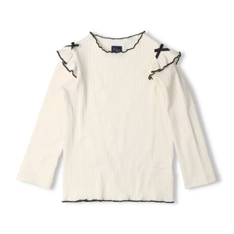 配色メロウがアクセントになった長袖Tシャツ、ロンT。肩のリボンのモチーフがポイント!1枚で着ても、インナーとしてジャンスカなどと合わせて着ても。色々と着回しのきくアイテム。【アイテム】トップス シンプル ガーリー フェミニン カジュアル お洒落 オシャレ かわいい 可愛い 普段着 デイリーウェア お出かけ着 お外着 お外遊び着 子ども こども 女児 女の子 ガールズ キッズ ベビーサイズ トドラーサイズ 幼稚園 保育園 小学校 通園 通学 小学生 2025年秋冬物新作 丸高衣料 ロングスリーブ 長袖 オフホワイト 白色 ピンク りぼん