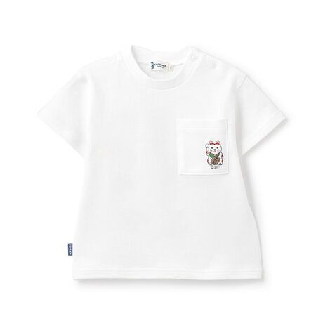 ポケットには招き猫の刺繍、後ろ身頃には日本の美味しい食べ物がたくさんプリントされている天竺素材の半袖Tシャツ。