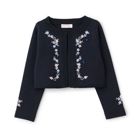 上品な花の刺しゅうをポイントにあしらったニット素材のボレロです。