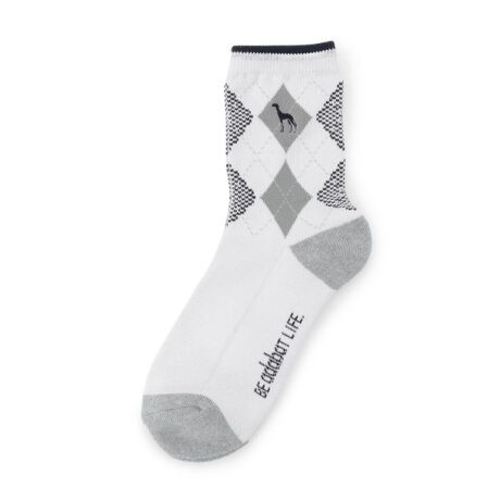 トラッドなスタイルを引き立てるアーガイル柄とサルーキーのコンビネーションが魅力のショートソックスです。