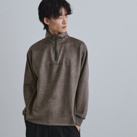 首元のファスナーの開き具合で表情の変わるハーフジップカットソー。