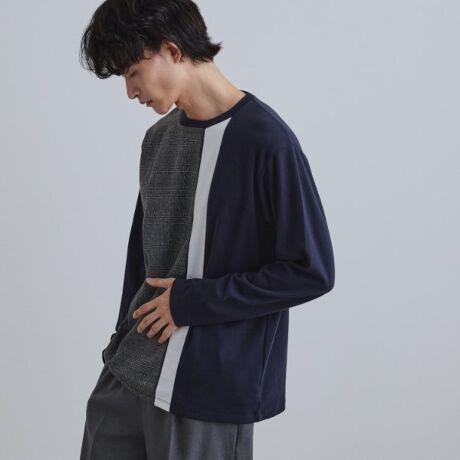 ブロッキングパターンの切り替えデザインにグレンチェック生地を部分的に使用したカットソー。