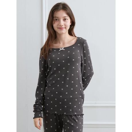 今年のHALLOWEEN COLLECTIONは、トレンドのリボン柄をフィーチャーした女子ライクなモノトーンスタイル。ソフトな風合いの針抜きカットソーに、ドット見えする小さなリボンプリントをあしらったプルオーバーです。メローの裾と袖口、上品なスクエア調の胸元に添えた小さなベロアリボンがアクセント。1枚でも、ワンピース等のインナーにも着用いただけるデザインです。同シリーズのニットカーディガンやロングパンツとのコーディネートがおすすめです。