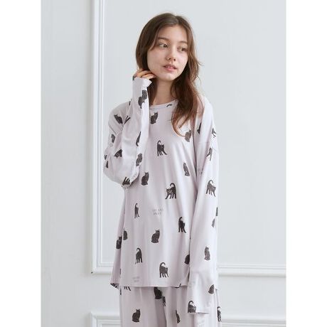 今年のHALLOWEEN COLLECTIONは、黒猫をテーマにした女子ライクなモノトーンスタイル。お座りポーズから、猫好きの方にはたまらない威嚇ポーズまで、表情豊かな黒猫を総柄プリントした柔らかな肌触りのロングTシャツです。猫の耳にパープルをあしらったハロウィンらしいカラーリング。左袖口にはキラリとしたシルバーの刺繍ロゴを入れました。同シリーズのロングパンツやニットウェアと組み合わせてお楽しみください。