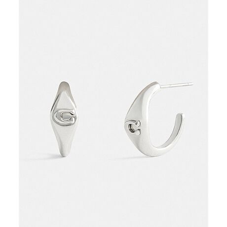ポリッシュ仕上げのシグネットをあしらった、耳たぶをハグするようなハギーピアス。ミニマルなデザインに、コーチの“C”がさりげなくクラシックな雰囲気を添えます。チタンポストで仕上げたラウンド クラッチ開閉式です。
