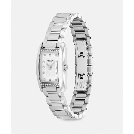 ステンレス スチールのブレスレットを合わせたデザインに、煌めくクリスタルがアクセントを添えます。文字盤にもスクエアのクリスタル マーカーが煌めきを放ちます。