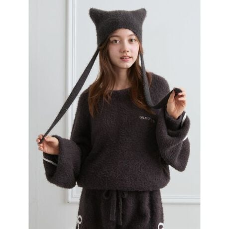 今年のHALLOWEEN COLLECTIONは、黒猫やリボンをフィーチャーした女子ライクなモノトーンスタイル。gelato piqueとしては初登場のアイテムとなる、猫耳デザインのバラクラバです。同シリーズのニットウェアと同じ’フェザー’のニットを使用しており、雑貨アイテムのみラメとスパンコールを施してキラキラした質感をプラス。シンプルな大人可愛いデザインで仕上げました。同シリーズのウェアや、雑貨シリーズと合わせるのがおすすめです。