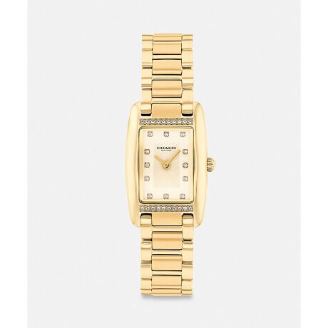 ゴールドトーンのブレスレットを合わせたデザインに、煌めくクリスタルがアクセントを添えます。文字盤にもスクエアのクリスタル マーカーが煌めきを放ちます。
