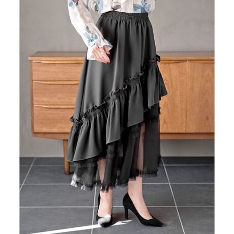斜めにあしらったたっぷりのフリルが華やかな装いに仕上げてくれます。