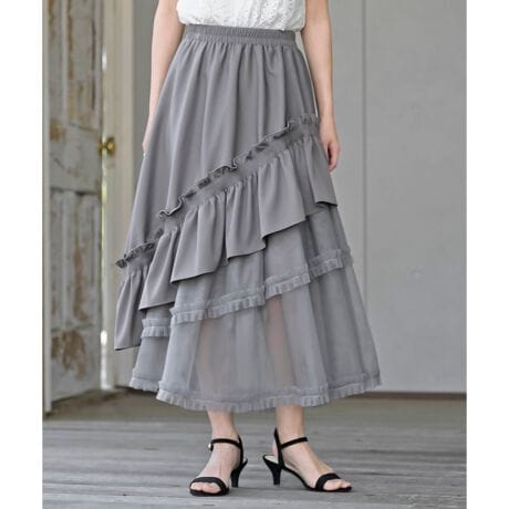 斜めにあしらったたっぷりのフリルが華やかな装いに仕上げてくれます。