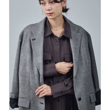 グレンチェック素材:レーヨンにウールを巻き付けた縦糸を使用し、上品な杢感をプラス。