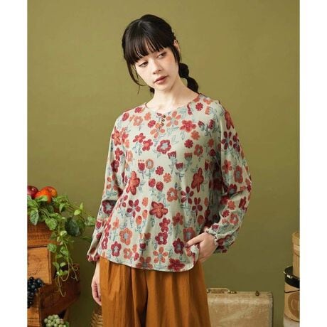 ジャカードの花柄が目を惹くホコモモラらしいカットソー。裾にかけて広がるシルエットとラグランスリーブがリラクシーな着用感を叶えます。顔周りがすっきり見える浅いV開きデザイン。袖口にタックを施し、丸みを持たせた袖が大人かわいい印象をプラス。首元の配色ボタンにも注目です。リラックス感と上品な雰囲気を併せ持った、ワードローブに揃えておきたいおすすめアイテムです。