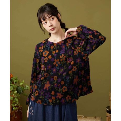 ジャカードの花柄が目を惹くホコモモラらしいカットソー。裾にかけて広がるシルエットとラグランスリーブがリラクシーな着用感を叶えます。顔周りがすっきり見える浅いV開きデザイン。袖口にタックを施し、丸みを持たせた袖が大人かわいい印象をプラス。首元の配色ボタンにも注目です。リラックス感と上品な雰囲気を併せ持った、ワードローブに揃えておきたいおすすめアイテムです。