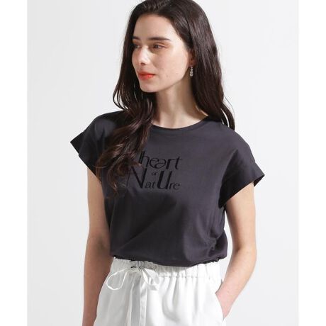 フレンチスリーブのロゴTシャツ。袖は、肩にゆったりとかかる丈で、ボクシーなシルエットでも男の子っぽくならず、大人の女性が着やすいデザインに仕上げました。脇にはマチを付けて、インナーが見えない工夫がされています。ロゴは、フロッキーで控えめな立体感と起毛感があります。The art of Nature(自然の美しさ)のロゴに隠れた heart(□) をさりげなく忍ばせた、遊び心あるグラフィックデザインです。