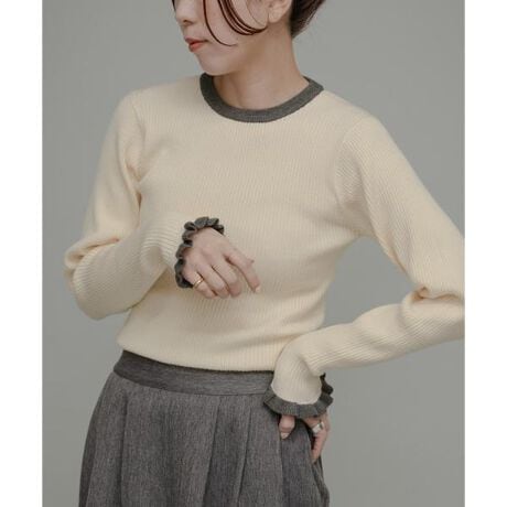 襟ぐりと袖口のバイカラーフリルがポイントのリブニット。