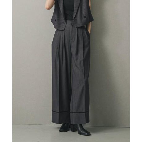キレイめな素材感とワイドシルエットが魅力のスラックス。左右に3本ずつ入ったタックが、動くたびに美しいドレープを作り、スタイルを美しく見せてくれます。裾の折り返しと脇に挟み込んだシアー素材が、シンプルな中にさりげない個性をプラス。ブラウスと合わせてオフィススタイルに、Tシャツと合わせてカジュアルに、と様々なシーンで活躍します。