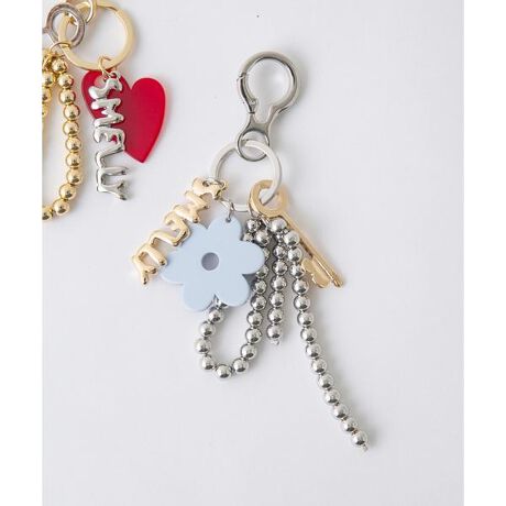 リボンのようなフォルムを象ったメタルボールに、ポップなデザインのチャームを組み合わせたキーチェーン。