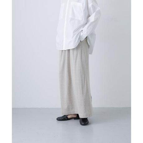 程よくゆとりがあるのにスッキリと見える穏やかなIラインシルエット。快適な着心地を叶えるカットソー素材でご用意しました。裏側にコットンが多くなるように編立られているので肌当たりの良さもポイント。表側はリネンがメインに出ていて上品で涼し気な風合いです。お出かけから日常まで様々なシーンで活躍。天竺素材ならではの優しい伸縮性とベンツ仕様により足さばきが良いです。ウエストは楽に穿ける総ゴム+紐の仕様を採用しています。お手持ちのトップスと、様々なスタイリングをお楽しみください。同素材でイージーパンツもご用意しています。