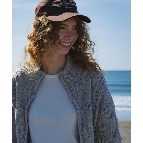 立体感のあるケーブル編みを施し、首元はすっきりとしたスタンドカラーでカジュアルながらも高見えするデザインに仕上げました。