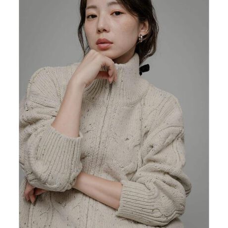 立体感のあるケーブル編みを施し、首元はすっきりとしたスタンドカラーでカジュアルながらも高見えするデザインに仕上げました。