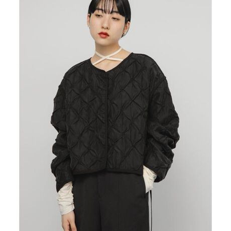 シャーリングデザインが華やかで存在感を放つジャケット。ブラウス感覚で羽織っていただける軽さや、表地の程よく光沢のあるシアー素材もポイントです。パイピング仕様がメリハリを出しているので、ほっこりし過ぎません。裾サイドもスリットが入っており、紐を垂らしたり結んだりと変えていただけます。