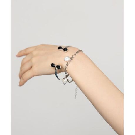 黒のエポキシ樹脂が付いたバングルと、淡水パールの付いたチェーンブレスレットのセットアイテム。単品使いはもちろん、2連重ね付けもバランス良く仕上がります。