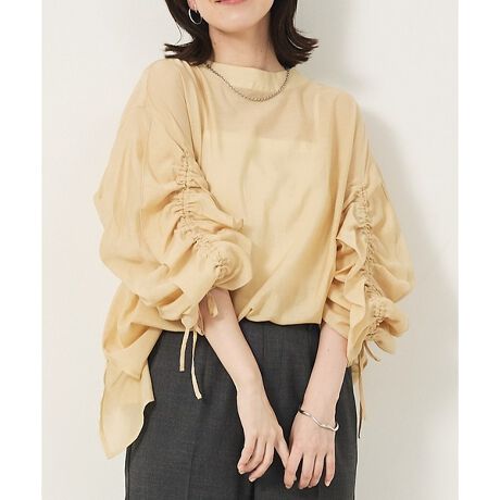 リッチなフリル×ギャザーの袖が目を引く、シアーのプルオンブラウス。袖がコードでギャザーを寄せられる仕組みになっています。身頃はスッキリシンプル、袖コンシャスでデザイン性を感じながらも、汎用性の高いアイテムに仕上がっています。