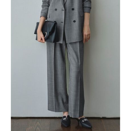 ■デザインウエスト部分のサイドバックルディテールが特徴的なセンタープレス入りのワイドパンツです。ウエストのタックによりヒップ周りに程良いゆとりが生まれ、ボディラインを拾いにくいフォルムのパンツです。さらにウエスト部分はゴム内蔵のスマートバック仕様で、ラクな履き心地なのも嬉しいポイントです。同素材のジャケットやブルゾン、キャミソールブラウスと合わせてセットアップはもちろん、単品でも着回しの利くアイテムです。
