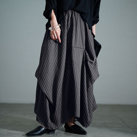 立体感のある変形シルエットが目を惹くモードなスカートは、穿くだけで存在感を高める一枚。ピンストライプ柄の生地で仕立てられ、都会的なスタイリッシュ感をプラスします。シェブロンのようなイレギュラーなヘムラインが足下にリズムを演出し、軽やかな印象に。動きのある変形シルエットで下半身のラインを拾うことなく、穿くだけで体型カバーに。ウエストにはギャザーゴムを採用し、長時間穿いてもリラクシーな穿き心地。絶妙なボリューム感と変形シルエットがスタイリングにと大人モードな個性を演出します。