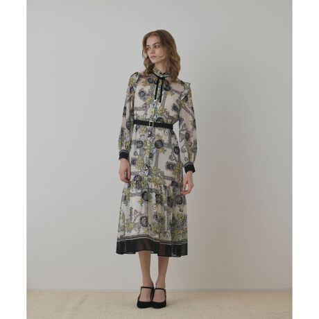 華やかで大人な佇まいのオーナメントフラワープリントワンピース。デザイナーが何度も試行錯誤を繰り返し、バランス良く配置したオーナメントとフラワー柄が美しく絡んだプリントが一際目を惹く一枚。軽くて落ち感のあるシフォン素材ながら、首元にはベルベットのリボンをトッピングして、シーズンらしいぬくもり感のある表情に仕立てています。ウエストにベルトを添えた、様々な体系の方が綺麗に着こなせる王道のフィット&フレアシルエット。首元と肩回りにはちびフリルを飾り、大人な中にも可愛さを秘めるデザインに仕上げました。クラシカルなムード漂うデザインですが、リボンの先端とベルトのさりげないゴールドメタルが洗練感のあるポイントとして効いています。袖あり・膝下の露出度控えめなルックスで、お食事会やお呼ばれシーンにもぴったりです。