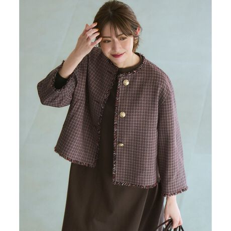 表情のあるツイードライクな質感がポイント。同素材のスカートと合わせたセットアップスタイルはもちろん、カジュアルなスタイリングにも合わせていただけるため、秋口の羽織として使いやすい1枚です。フロントの釦がアクセントになっています。カラーは、華やぎムードのレッドミックス(#310)、季節感のあるブラウンチェック(#335)の2色展開です。